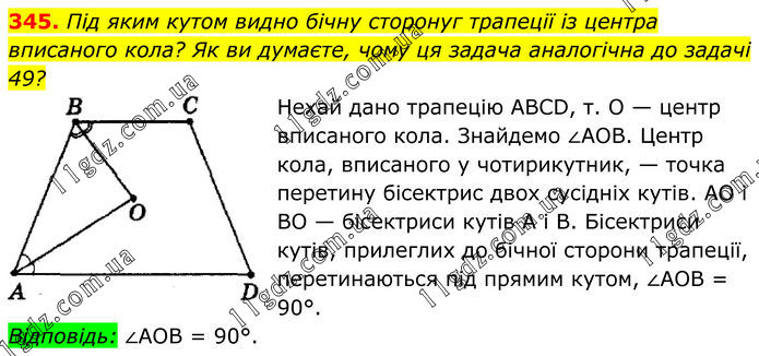 345. Під яким кутом видно бічну сторонуг трапеції із центра вписаного кола? Як ви думаєте, чому ця задача аналогічна до задачі 49? Нехай дано трапецію АВСD, т. О — центр вписаного кола. Знайдемо ∠AОВ. Центр кола, вписаного у чотирикутник, — точка перетину бісектрис двох сусідніх кутів. АО і ВО — бісектриси кутів А і В. Бісектриси кутів, прилеглих до бічної сторони трапеції, перетинаються під прямим кутом, ∠АОВ = 90°. Відповідь: ∠АОВ = 90°.