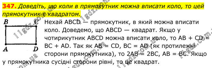 347. Доведіть, що коли в прямокутник можна вписати коло, то цей прямокутник є квадратом. Нехай ABCD — прямокутник, в який можна вписати коло. Доведемо, що ABCD — квадрат. Якщо у чотирикутник ABCD можна вписати коло, то АВ + CD = ВС + AD. Так як АВ = CD, ВС = AD (як протилежні сторони прямокутника), то 2AB = 2ВС, АВ = ВС. Якщо у прямокутника сусідні сторони рівні, то це квадрат.