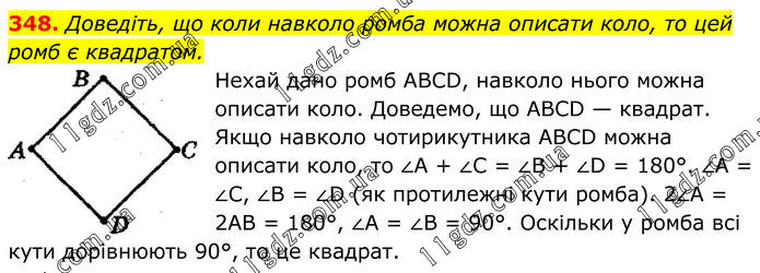 348. Доведіть, що коли навколо ромба можна описати коло, то цей ромб є квадратом. Нехай дано ромб ABCD, навколо нього можна описати коло. Доведемо, що ABCD — квадрат. Якщо навколо чотирикутника ABCD можна описати коло, то ∠A + ∠C = ∠B + ∠D = 180°. ∠A = ∠C, ∠B = ∠D (як протилежні кути ромба). 2∠A = 2АВ = 180°, ∠A = ∠B = 90°. Оскільки у ромба всі кути дорівнюють 90°, то це квадрат.