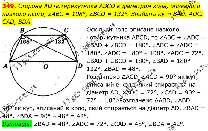 349. Сторона AD чотирикутника ABCD є діаметром кола, описаного навколо нього, ∠ABC = 108°, ∠BCD = 132°. Знайдіть кути BAD, ADC, CAD, BDA. Оскільки коло описане навколо чотирикутника ABCD, то ∠ABC + ∠ADC = ∠BAD + ∠BCD = 180°. ∠ABC + ∠ADC = 180°, ∠ADC = 180° – 108°, ∠ADC = 72°. ∠BAD + ∠BCD = 180°, ∠BAD = 180° – 132°, ∠BAD = 48°. Розглянемо ∆ACD, ∠ACD = 90° як кут, вписаний в коло, який спирається на діаметр AD, ∠ADC = 72°, ∠CAD = 90° – 72° = 18°. Розглянемо ∆ABD, ∠ABD = 90° як кут, вписаний в коло, який спирається на діаметр AD, ∠BAD = 48°, ∠BDA = 90° – 48° = 42°. Відповідь: ∠BAD = 48°, ∠ADC = 72°, ∠CAD = 48°, ∠BDA = 42°.