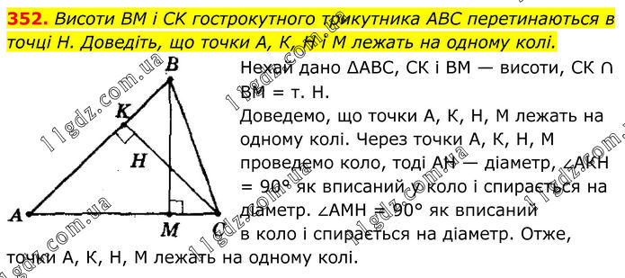 352. Висоти BM і CK гострокутного трикутника ABC перетинаються в точці Н. Доведіть, що точки А, К, H і M лежать на одному колі. Нехай дано ∆АВС, СК і ВМ — висоти, СК ∩ ВМ = т. Н. Доведемо, що точки А, К, Н, М лежать на одному колі. Через точки А, К, Н, М проведемо коло, тоді АH — діаметр, ∠АКН = 90° як вписаний у коло і спирається на діаметр. ∠АМН = 90° як вписаний в коло і спирається на діаметр. Отже, точки А, К, Н, М лежать на одному колі.