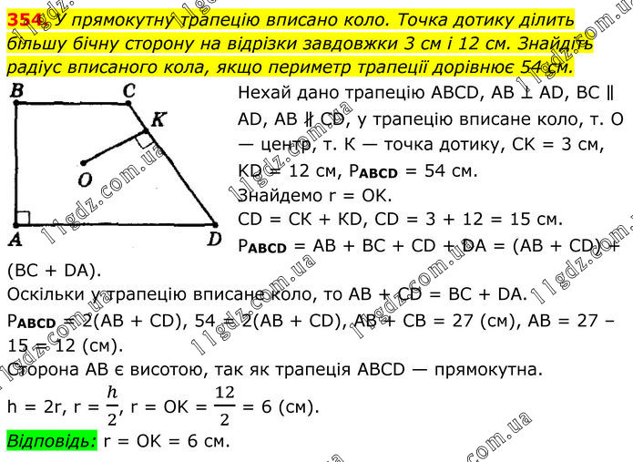 354. У прямокутну трапецію вписано коло. Точка дотику ділить більшу бічну сторону на відрізки завдовжки 3 см і 12 см. Знайдіть радіус вписаного кола, якщо периметр трапеції дорівнює 54 см. Нехай дано трапецію АВСD, АВ ⊥ АD, ВС ∥ АD, АВ ∦ СD, у трапецію вписане коло, т. О — центр, т. К — точка дотику, СK = 3 см, KD = 12 см, РABCD = 54 см. Знайдемо r = ОK. СD = СК + КD, СD = 3 + 12 = 15 см. РABCD = АВ + ВС + СD + DА = (АВ + СD) + (ВС + DА). Оскільки у трапецію вписане коло, то АВ + СD = ВС + DА. PABCD = 2(АВ + СD), 54 = 2(АВ + СD), АВ + СВ = 27 (см), АВ = 27 – 15 = 12 (см). Сторона АВ є висотою, так як трапеція АВСD — прямокутна. h = 2r, r = h/2, r = OK = 12/2 = 6 (см). Відповідь: r = ОK = 6 см.