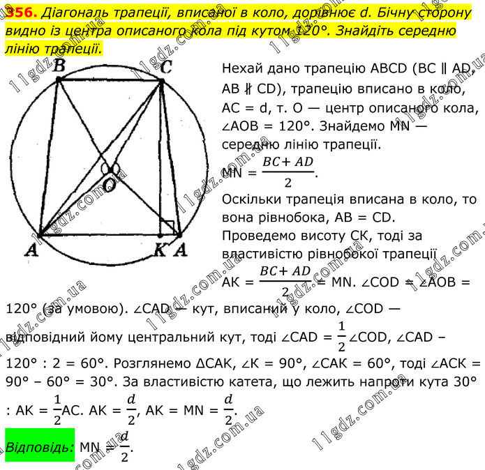 356. Діагональ трапеції, вписаної в коло, дорівнює d. Бічну сторону видно із центра описаного кола під кутом 120°. Знайдіть середню лінію трапеції. Нехай дано трапецію ABCD (BC ∥ AD, AB ∦ CD), трапецію вписано в коло, AC = d, т. О — центр описаного кола, ∠АОВ = 120°. Знайдемо MN — середню лінію трапеції. MN = (BC+ AD)/2. Оскільки трапеція вписана в коло, то вона рівнобока, АВ = СD. Проведемо висоту СК, тоді за властивістю рівнобокої трапеції АК = (BC+ AD)/2 = MN. ∠COD = ∠АОВ = 120° (за умовою). ∠CAD — кут, вписаний у коло, ∠COD — відповідний йому центральний кут, тоді ∠CAD = 1/2∠COD, ∠CAD – 120° : 2 = 60°. Розглянемо ∆CAK, ∠К = 90°, ∠САК = 60°, тоді ∠АСК = 90° – 60° = 30°. За властивістю катета, що лежить напроти кута 30° : AK = 1/2AC. AK = d/2, AK = MN = d/2. Відповідь: MN = d/2.