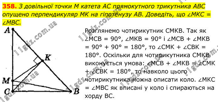 358. З довільної точки M катета AC прямокутного трикутника ABC опущено перпендикуляр MK на гіпотенузу AВ. Доведіть, що ∠MKC = ∠MBC. Розглянемо чотирикутник СМКВ. Так як ∠МСВ = 90°, ∠МКВ = 90° і ∠МСВ + ∠МКВ = 90° + 90° = 180°, то ∠СМК + ∠СВК = 180°. Оскільки для чотирикутника СМКВ виконується умова: ∠МСВ + ∠МКВ = ∠СМК + ∠СВК = 180°, то навколо цього чотирикутника можна описати коло. ∠МКС = ∠МВС як вписані у коло і спираються на хорду ВС.