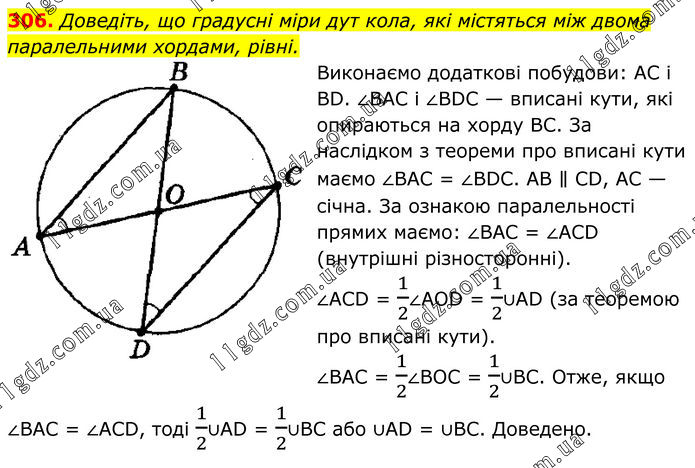 306. Доведіть, що градусні міри дут кола, які містяться між двома паралельними хордами, рівні. Виконаємо додаткові побудови: АС і BD. ∠BAC і ∠BDC — вписані кути, які опираються на хорду ВС. За наслідком з теореми про вписані кути маємо ∠BAC = ∠BDC. АВ ∥ CD, АС — січна. За ознакою паралельності прямих маємо: ∠BAC = ∠ACD (внутрішні різносторонні). ∠ACD = 1/2∠AOD = 1/2∪AD (за теоремою про вписані кути). ∠BAC = 1/2∠BOC = 1/2∪ВС. Отже, якщо ∠BAC = ∠ACD, тоді 1/2∪AD = 1/2∪ВС або ∪AD = ∪ВС. Доведено.