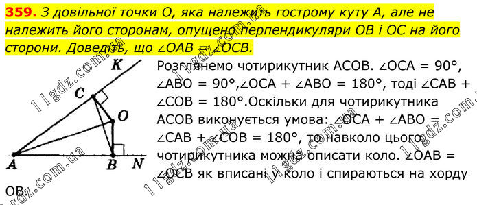 359. З довільної точки О, яка належить гострому куту А, але не належить його сторонам, опущено перпендикуляри OB і OC на його сторони. Доведіть, що ∠OAB = ∠OCB. Розглянемо чотирикутник АСОВ. ∠ОСА = 90°, ∠АВО = 90°,∠ОСА + ∠АВО = 180°, тоді ∠САВ + ∠СОВ = 180°. Оскільки для чотирикутника АСОВ виконується умова: ∠ОСА + ∠АВО = ∠САВ + ∠СОВ = 180°, то навколо цього чотирикутника можна описати коло. ∠ОАВ = ∠ОСВ як вписані у коло і спираються на хорду ОВ.