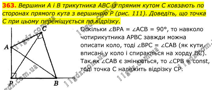 363. Вершини A i B трикутника ABC із прямим кутом C ковзають по сторонах прямого кута з вершиною P (рис. 111). Доведіть, що точка C при цьому переміщується по відрізку. Оскільки ∠BPA = ∠ACB = 90°, то навколо чотирикутника АРВС завжди можна описати коло, тоді ∠BPC = ∠CAB (як кути, вписані у коло і спираються на хорду ВС). Так як ∠CAB є змінюється, то ∠CPB = const, тоді точка С належить відрізку СР.