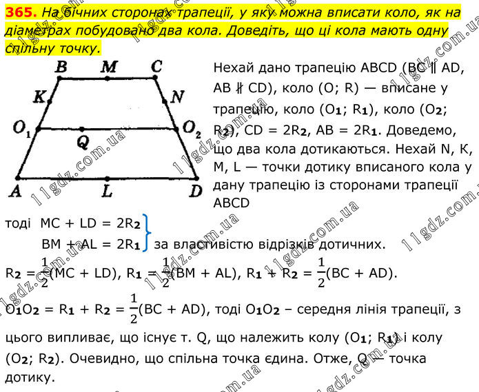 365. На бічних сторонах трапеції, у яку можна вписати коло, як на діаметрах побудовано два кола. Доведіть, що ці кола мають одну спільну точку. Нехай дано трапецію АВСD (ВС ∥ АD, АВ ∦ СD), коло (О; R) — вписане у трапецію, коло (О1; R1), коло (O2; R2), СD = 2R2, АВ = 2R1. Доведемо, що два кола дотикаються. Нехай N, К, М, L — точки дотику вписаного кола у дану трапецію із сторонами трапеції АВСD тоді МС + LD = 2R2 ВМ + АL = 2R1 за властивістю відрізків дотичних. R2 = 1/2(MC + LD), R1 = 1/2(BM + AL), R1 + R2 = 1/2(ВС + AD). O1O2 = R1 + R2 = 1/2(ВС + AD), тоді О1О2 – середня лінія трапеції, з цього випливає, що існує т. Q, що належить колу (O1; R1) і колу (О2; R2). Очевидно, що спільна точка єдина. Отже, Q — точка дотику.