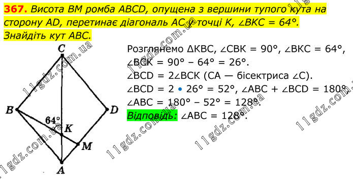 367. Висота BM ромба ABCD, опущена з вершини тупого кута на сторону AD, перетинає діагональ AC у точці K, ∠BKC = 64°. Знайдіть кут ABC. Розглянемо ∆КВС, ∠СВК = 90°, ∠ВКС = 64°, ∠ВСК = 90° – 64° = 26°. ∠BCD = 2∠ВСК (СА — бісектриса ∠С). ∠BCD = 2 • 26° = 52°, ∠ABC + ∠BCD = 180°, ∠АВС = 180° – 52° = 128°. Відповідь: ∠АВС = 128°.