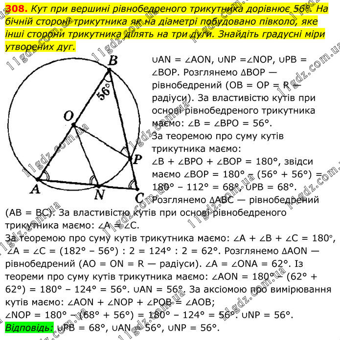 308. Кут при вершині рівнобедреного трикутника дорівнює 56°. На бічній стороні трикутника як на діаметрі побудовано півколо, яке інші сторони трикутника ділять на три дуги. Знайдіть градусні міри утворених дуг. ∪AN = ∠AON, ∪NP =∠NOP, ∪PB = ∠ВОР. Розглянемо ∆ВОР — рівнобедрений (OB = OP = R — радіуси). За властивістю кутів при основі рівнобедреного трикутника маємо: ∠B = ∠ВРО = 56°. За теоремою про суму кутів трикутника маємо: ∠В + ∠ВРО + ∠ВОР = 180°, звідси маємо ∠ВОР = 180° – (56° + 56°) = 180° – 112° = 68°, ∪PB = 68°. Розглянемо ∆ABC — рівнобедрений (AВ = ВС). За властивістю кутів при основі рівнобедреного трикутника маємо: ∠A = ∠C. За теоремою про суму кутів трикутника маємо: ∠A + ∠B + ∠C = 180°, ∠А = ∠C = (182° – 56°) : 2 = 124° : 2 = 62°. Розглянемо ∆AON — рівнобедрений (AO = ON = R — радіуси). ∠A = ∠ONA = 62°. Із теореми про суму кутів трикутника маємо: ∠AON = 180° – (62° + 62°) = 180° – 124° = 56°. ∪AN = 56°. За аксіомою про вимірювання кутів маємо: ∠AON + ∠NOP + ∠РОВ = ∠АОВ; ∠NOP = 180° – (68° + 56°) = 180° – 124° = 56°. ∪NP = 56°. Відповідь: ∪PB = 68°, ∪AN = 56°, ∪NP = 56°.