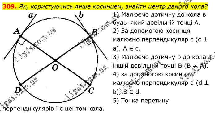 309. Як, користуючись лише косинцем, знайти центр даного кола? 1) Малюємо дотичну до кола в будь–який довільній точці А. 2) За допомогою косинця малюємо перпендикуляр с (с ⊥ а), А ∈ с. 3) Малюємо дотичну b до кола в іншій довільній точці В (В ≠ А). 4) за допомогою косинця малюємо перпендикуляр d (d ⊥ b), В ∈ d. 5) Точка перетину перпендикулярів і є центом кола.