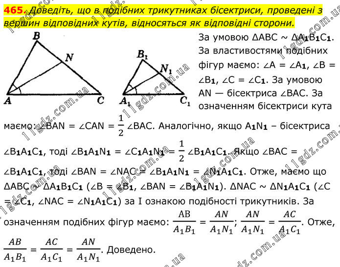 Доведіть, що в подібних трикутниках бісектриси, проведені з вершин відповідних кутів, відносяться як відповідні сторони. За умовою ∆АВС ~ ∆А1В1С1. За властивостями подібних фігур маємо: ∠А = ∠А1, ∠В = ∠В1, ∠С = ∠C1. За умовою AN — бісектриса ∠ВАС. За означенням бісектриси кута маємо: ∠BAN = ∠CAN = 1/2 ∠ВАС. Аналогічно, якщо A1N1 – бісектриса ∠B1A1C1, тоді ∠B1A1N1 = ∠C1A1N1 = 1/2 ∠B1A1C1. Якщо ∠ВАС = ∠В1А1С1, тоді ∠BAN = ∠NAC = ∠B1A1N1 = ∠N1A1C1. Отже, маємо що ∆ABC ~ ∆A1B1C1 (∠B = ∠B1, ∠BAN = ∠B1A1N1). ∆NAC ~ ∆N1A1C1 (∠C = ∠C1, ∠NAC = ∠N1A1С1) за І ознакою подібності трикутників. За означенням подібних фігур маємо: АВ/(A_1 B_1 ) = AN/(A_1 N_1 ); AN/(A_1 N_1 ) = AC/(A_1 C_1 ). Отже, AB/(A_1 B_1 ) = AC/(A_1 C_1 ) = AN/(A_1 N_1 ). Доведено.