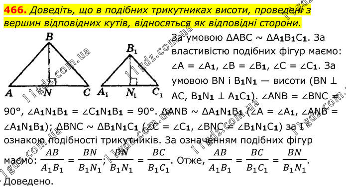 Доведіть, що в подібних трикутниках висоти, проведені з вершин відповідних кутів, відносяться як відповідні сторони. За умовою ∆АВС ~ ∆А1B1С1. За властивістю подібних фігур маємо: ∠А = ∠A1, ∠В = ∠B1, ∠С = ∠C1. За умовою ВN і В1N1 — висоти (ВN ⊥ АС, В1N1 ⊥ А1С1). ∠ANB = ∠BNC = 90°, ∠A1N1B1 = ∠C1N1B1 = 90°. ∆ANB ~ ∆А1N1В1 (∠А = ∠A1, ∠АNВ = ∠A1N1B1); ∆ВNС ~ ∆В1N1С1 (∠С = ∠С1, ∠ВNC = ∠В1N1С1) за І ознакою подібності трикутників. За означенням подібних фігур маємо: AB/(A_1 B_1 ) = BN/(B_1 N_1 ); BN/(B_1 N_1 ) = BC/(B_1 C_1 ). Отже, AB/(A_1 B_1 ) = BC/(B_1 C_1 ) = BN/(B_1 N_1 ). Доведено.