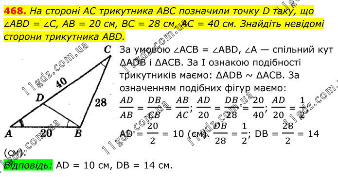 На стороні AC трикутника ABC позначили точку D таку, що ∠ABD = ∠C, AB = 20 см, BC = 28 см, AC = 40 см. Знайдіть невідомі сторони трикутника ABD. За умовою ∠АСВ = ∠АВD, ∠A — спільний кут ∆АDВ і ∆АСВ. За І ознакою подібності трикутників маємо: ∆АDВ ~ ∆АСВ. За означенням подібних фігур маємо: AD/AB = DB/CB = AB/AC; AD/20 = DB/28 = 20/40; AD/20 = 1/2; AD = 20/2 = 10 (см). DB/28 = 1/2; DB = 28/2 = 14 (см). Відповідь: AD = 10 см, DB = 14 см.