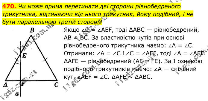 Чи може прима перетинати дві сторони рівнобедреного трикутника, відтинаючи від нього трикутник, йому подібний, і не бути паралельною третій стороні? Якщо ∠С = ∠AЕF, тоді ∆АВС — рівнобедрений, АВ = ВС. За властивістю кутів при основі рівнобедреного трикутника маємо: ∠А = ∠С. Отримали: ∠А = ∠С і ∠С = ∠АЕF, тоді ∠А = ∠АЕF. ∆АFЕ — рівнобедрений (АF = FE). За І ознакою подібності трикутників маємо: ∠А — спільний кут, ∠AEF = ∠С. ∆АFЕ ~ ∆АВС.
