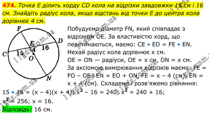Точка E ділить хорду CD кола на відрізки завдовжки 15 см і 16 см. Знайдіть радіус кола, якщо відстань від точки E до центра кола дорівнює 4 см. Побудуємо діаметр FN, який співпадає з відрізком ОЕ. За властивістю хорд, що перетинаються, маємо: СЕ • ЕD = FЕ • ЕN. Нехай радіус кола дорівнює x см. ОЕ = ON — радіуси, ОЕ = х см, ОN = x см. За аксіомою вимірювання відрізків маємо: FЕ = FО – ОЕ і ЕN = ЕО + ОN, FE = х – 4 (см), ЕN = х + 4 (см). Складемо і розв’яжемо рівняння: 15 • 16 = (х – 4)(х + 4); x2 – 16 = 240; х2 = 240 + 16; х2 = 256; х = 16. Відповідь: 16 см.