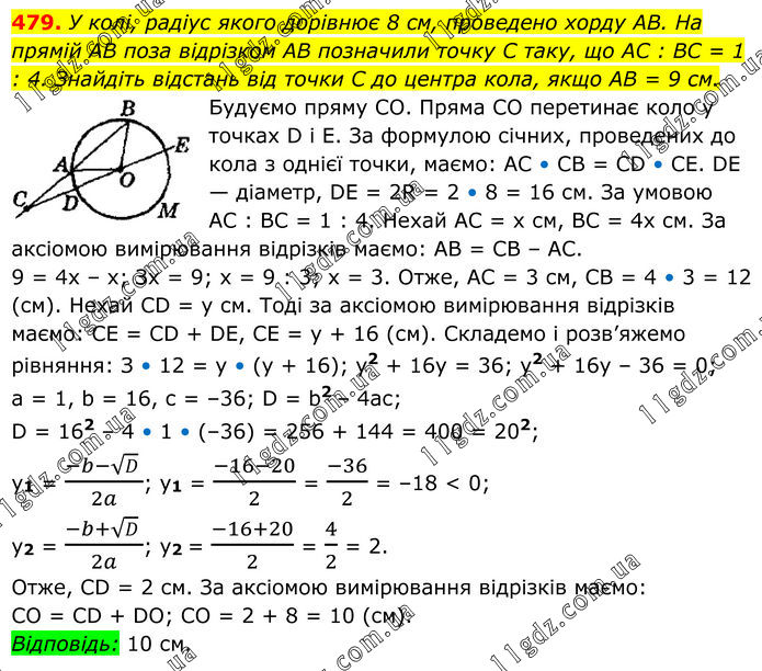 У колі, радіус якого дорівнює 8 см, проведено хорду AB. На прямій AB поза відрізком AB позначили точку C таку, що AC : BC = 1 : 4. Знайдіть відстань від точки C до центра кола, якщо AB = 9 см. Будуємо пряму СО. Пряма СО перетинає коло у точках D і Е. За формулою січних, проведених до кола з однієї точки, маємо: АС • СВ = СD • СЕ. DЕ — діаметр, DЕ = 2R = 2 • 8 = 16 см. За умовою АС : ВС = 1 : 4. Нехай АС = x см, ВС = 4х см. За аксіомою вимірювання відрізків маємо: АВ = СВ – АС. 9 = 4х – х; Зх = 9; х = 9 : 3; x = 3. Отже, АС = 3 см, СВ = 4 • 3 = 12 (см). Нехай СD = у см. Тоді за аксіомою вимірювання відрізків маємо: СЕ = СD + DЕ, СЕ = у + 16 (см). Складемо і розв’яжемо рівняння: З • 12 = у • (у + 16); у2 + 16y = 36; у2 + 16у – 36 = 0; а = 1, b = 16, с = –36; D = b2 – 4ас; D = 162 – 4 • 1 • (–36) = 256 + 144 = 400 = 202; y1 = (-b-√D )/2a; y1 = (-16-20)/2 = (-36)/2 = –18 < 0; y2 = (-b+√D )/2a; y2 = (-16+20)/2 = 4/2 = 2. Отже, СD = 2 см. За аксіомою вимірювання відрізків маємо: СО = СD + DО; СО = 2 + 8 = 10 (см). Відповідь: 10 см.
