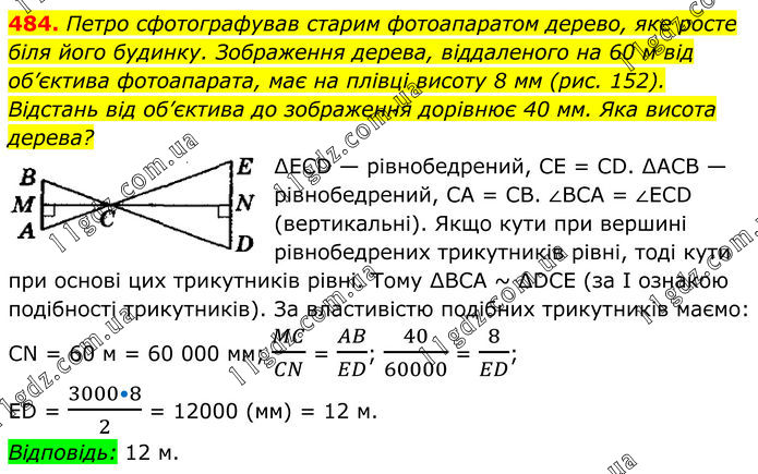 Петро сфотографував старим фотоапаратом дерево, яке росте біля його будинку. Зображення дерева, віддаленого на 60 м від об’єктива фотоапарата, має на плівці висоту 8 мм (рис. 152). Відстань від об’єктива до зображення дорівнює 40 мм. Яка висота дерева? ∆ЕСD — рівнобедрений, СЕ = СD. ∆АСВ — рівнобедрений, СА = СВ. ∠ВСА = ∠ЕСD (вертикальні). Якщо кути при вершині рівнобедрених трикутників рівні, тоді кути при основі цих трикутників рівні. Тому ∆ВСА ~ ∆DСE (за І ознакою подібності трикутників). За властивістю подібних трикутників маємо: СN = 60 м = 60 000 мм; MC/CN = AB/ED; 40/60000 = 8/ED; ED = (3000•8)/2 = 12000 (мм) = 12 м. Відповідь: 12 м.