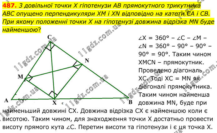 3 довільної точки Х гіпотенузи АВ прямокутного трикутника АВС опущено перпендикуляри ХМ i XN відповідно на катети СА i СВ. При якому положенні точки Х на гіпотенузі довжина відрізка MN буде найменшою? ∠Х = 360° – ∠C – ∠М – ∠N = 360° – 90° – 90° – 90° = 90°. Таким чином ХMСN – прямокутник. Проведемо діагональ XC. Тоді XC = MN як діагоналі прямокутника. Таким чином найменша довжина MN, буде при найменьший довжині СX. Довжина відрізка СХ є найменшою коли є висотою. Таким чином, для знаходження точки Х достатньо провести висоту прямого кута ∠C. Перетин висоти та гіпотенузи і є ця точка Х.