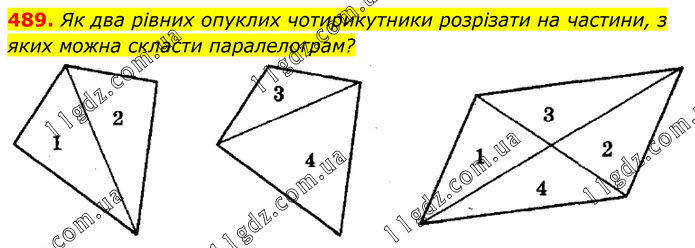 489. Як два рівних опуклих чотирикутники розрізати на частини, з яких можна скласти паралелограм?