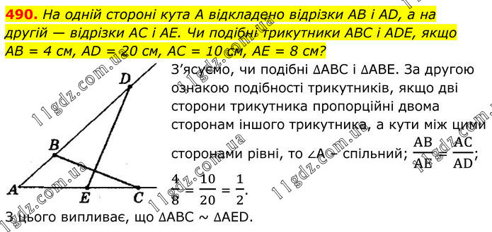 490. На одній стороні кута А відкладено відрізки AB і AD, а на другій — відрізки AC і AE. Чи подібні трикутники ABC і ADE, якщо AB = 4 cм, AD = 20 см, AC = 10 cм, AE = 8 см? З’ясуємо, чи подібні ∆АВС і ∆АВЕ. За другою ознакою подібності трикутників, якщо дві сторони трикутника пропорційні двома сторонам іншого трикутника, а кути між цими сторонами рівні, то ∠А – спільний; AB/AE = AC/AD; 4/8 = 10/20 = 1/2. З цього випливає, що ∆АВС ~ ∆АЕD.