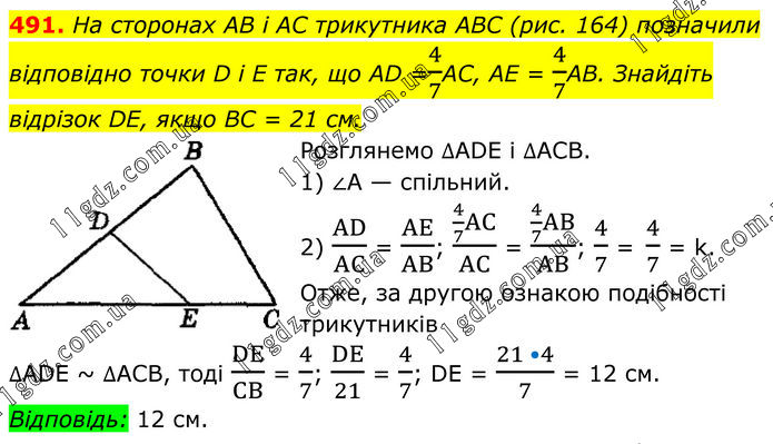 491. На сторонах AB і AC трикутника ABC (рис. 164) позначили відповідно точки D i E так, що AD =4/7AC, AE = 4/7AB. Знайдіть відрізок DE, якщо BC = 21 см. Розглянемо ∆АDЕ і ∆АСВ. 1) ∠А — спільний. 2) AD/AC = AE/AB; (4/7 AC)/AC = (4/7 AB)/AB; 4/7 = 4/7 = k. Отже, за другою ознакою подібності трикутників ∆АDЕ ~ ∆АСВ, тоді DE/CB = 4/7; DE/21 = 4/7; DE = (21 •4)/7 = 12 см. Відповідь: 12 см.