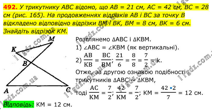 492. У трикутнику ABC відомо, що AB = 21 см, AC = 42 см, BC = 28 см (рис. 165). На продовженнях відрізків AB і BC за точку В відкладено відповідно відрізки BM і BK, BM = 8 см, BK = 6 см. Знайдіть відрізок KM. Розглянемо ∆АВС і ∆КВМ. 1) ∠ABC = ∠КВМ (як вертикальні). 2) AB/KB = BC/BM; 21/6 = 8/8 = 7/2 = k. Отже, за другою ознакою подібності трикутників ∆АВС ~ ∆КВМ, тоді AC/KM = 7/2; 42/KM = 7/2; KM = (42 •2)/7 = 12 см. Відповідь: КМ = 12 см.