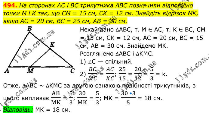494. На сторонах AC і BC трикутника ABC позначили відповідно точки M і K так, що CM = 15 см, CK = 12 см. Знайдіть відрізок MK, якщо AC = 20 см, BC = 25 см, AB = 30 см. Нехай дано ∆АВС, т. М ∈ АС, т. K ∈ ВС, СМ = 15 см, CK = 12 см, АС = 20 см, ВС = 15 см, АВ = 30 см. Знайдемо МК. Розглянемо ∆АВС і ∆КМС. 1) ∠С — спільний. 2) BC/MC = AC/KC; 25/15 = 20/12 = 5/3 = k. Отже, ∆АВС ~ ∆КМС за другою ознакою подібності трикутників, з цього випливає AB/MK = 5/3; 30/MK = 5/3; MK = (30 •3)/5 = 18 см. Відповідь: МК = 18 см.