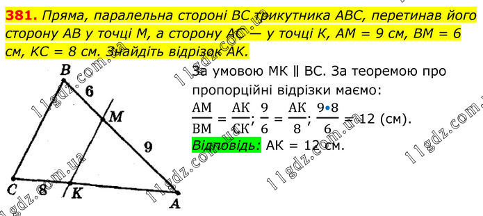 381. Пряма, паралельна стороні BC трикутника ABC, перетинав його сторону AB у точці М, а сторону AC — у точці К, AM = 9 см, BM = 6 см, KC = 8 см. Знайдіть відрізок AK. За умовою МК ∥ ВС. За теоремою про пропорційні відрізки маємо: АМ/ВМ = АК/СК; 9/6 = АК/8; (9•8)/6 = 12 (см). Відповідь: АК = 12 см.