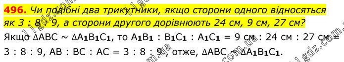 496. Чи подібні два трикутники, якщо сторони одного відносяться як 3 : 8 : 9, а сторони другого дорівнюють 24 см, 9 см, 27 см? Якщо ∆АВС ~ ∆А1B1С1, то А1В1 : В1С1 : А1С1 = 9 см : 24 см : 27 см = 3 : 8 : 9, АВ : ВС : АС = 3 : 8 : 9 , отже, ∆АВС ~ ∆А1B1С1.