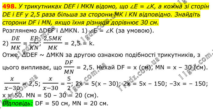 498. У трикутниках DEF і MKN відомо, що ∠E = ∠K, а кожна зі сторін DE і EF у 2,5 раза більша за сторони MK і KN відповідно. Знайдіть сторони DF і MN, якщо їхня різниця дорівнює 30 см. Розглянемо ∆DЕF і ∆МКN. 1) ∠Е = ∠К (за умовою). 2) DE/MK = EF/KN; 2,5MK/MK = 2,5 = k. Отже, ∆DEF ~ ∆MKN за другою ознакою подібності трикутників, з цього випливає, що DF/MN = 2,5. Нехай DF = x (см), МN = х – 30 (см). x/(x-30) = 2,5; x/(x-30) = 5/2; 2x = 5(x – 30); 2x = 5x – 150; –3х = – 150; х = 50. МN = 50 – 30 = 20 (см). Відповідь: DF = 50 см, МN = 20 см.