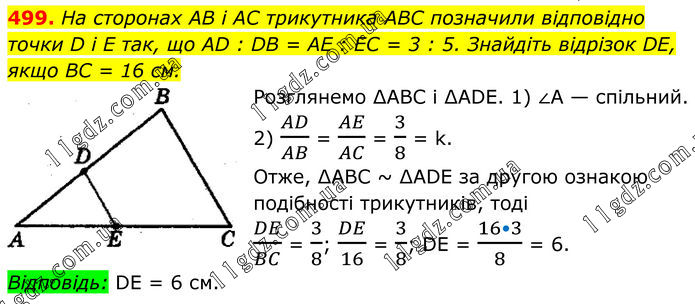 499. На сторонах AB і AC трикутника ABC позначили відповідно точки D i E так, що AD : DB = AE : EC = 3 : 5. Знайдіть відрізок DE, якщо BC = 16 см. Розглянемо ∆АВС і ∆АDЕ. 1) ∠А — спільний. 2) AD/AB = AE/AC = 3/8 = k. Отже, ∆АВС ~ ∆АDЕ за другою ознакою подібності трикутників, тоді DE/BC = 3/8; DE/16 = 3/8; DE = (16•3)/8 = 6. Відповідь: DЕ = 6 см.