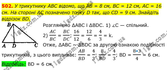 У трикутнику ABC відомо, що AB = 8 см, BC = 12 см, AC = 16 см. На стороні AC позначено точку D так, що CD = 9 см. Знайдіть відрізок BD. Розглянемо ∆АВС і ∆ВDС. 1) ∠С — спільний. 2) AC/BC = BC/DC; 16/12 = 12/6 = 4/3 = k. Отже, ∆АВС ~ ∆ВDС за другою ознакою подібності трикутників, з цього випливає: AB/BD = 4/3; 8/BD = 4/3; BD = (8•3)/4 = 6 см. Відповідь: ВD = 6 см.