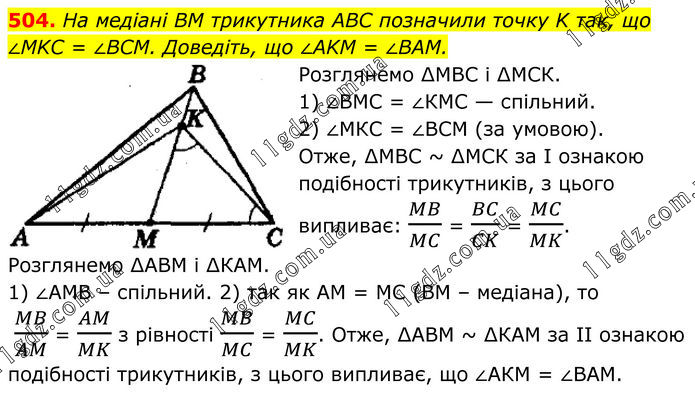504. На медіані BM трикутника ABC позначили точку K так, що ∠MKC = ∠BCM. Доведіть, що ∠AKM = ∠BAM. Розглянемо ∆МВС і ∆МСК. 1) ∠ВМС = ∠КМС — спільний. 2) ∠МКС = ∠ВСМ (за умовою). Отже, ∆МВС ~ ∆МСК за І ознакою подібності трикутників, з цього випливає: MB/MC = BC/CK = MC/MK. Розглянемо ∆АВМ і ∆КАМ. 1) ∠AMB – спільний. 2) так як АМ = МС (ВМ – медіана), то MB/AM = AM/MK з рівності MB/MC = MC/MK. Отже, ∆АВМ ~ ∆КАМ за II ознакою подібності трикутників, з цього випливає, що ∠АКМ = ∠ВАМ.