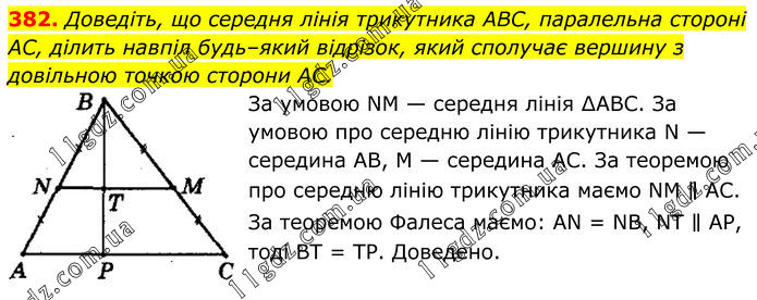 382. Доведіть, що середня лінія трикутника ABC, паралельна стороні AC, ділить навпіл будь–який відрізок, який сполучає вершину з довільною точкою сторони AC. За умовою NМ — середня лінія ∆АВС. За умовою про середню лінію трикутника N — середина АВ, M — середина АС. За теоремою про середню лінію трикутника маємо NМ ∥ АС. За теоремою Фалеса маємо: АN = NВ, NТ ∥ АР, тоді ВТ = ТР. Доведено.