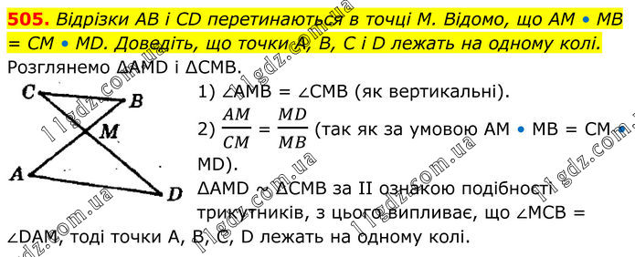 505. Відрізки AB і CD перетинаються в точці М. Відомо, що AM • MB = CM • MD. Доведіть, що точки A, B, C i D лежать на одному колі. Розглянемо ∆АМD і ∆СМВ. 1) ∠АМВ = ∠СМВ (як вертикальні). 2) AM/CM = MD/MB (так як за умовою АМ • МВ = СМ • МD). ∆АМD ~ ∆СМВ за II ознакою подібності трикутників, з цього випливає, що ∠МСВ = ∠DАМ, тоді точки А, В, С, D лежать на одному колі.
