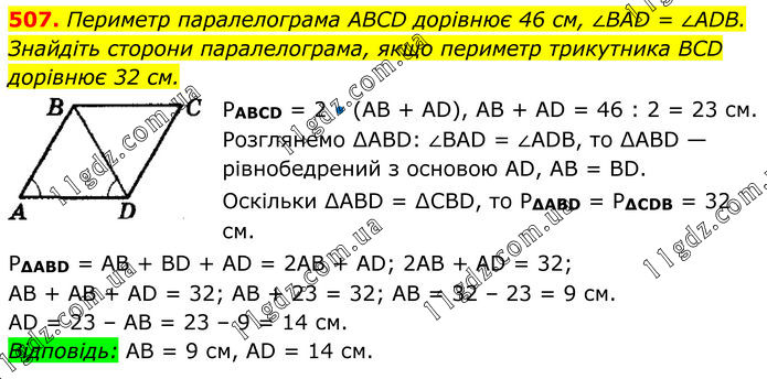 507. Периметр паралелограма ABCD дорівнює 46 см, ∠BAD = ∠ADB. Знайдіть сторони паралелограма, якщо периметр трикутника BCD дорівнює 32 см. РABCD = 2 • (АВ + АD), АВ + АD = 46 : 2 = 23 см. Розглянемо ∆АВD: ∠ВАD = ∠ADB, то ∆АВD — рівнобедрений з основою АD, АВ = ВD. Оскільки ∆АВD = ∆СВD, то Р∆ABD = P∆CDB = 32 см. Р∆ABD = АВ + ВD + АD = 2АВ + АD; 2АВ + АD = 32; АВ + АВ + АD = 32; АВ + 23 = 32; АВ = 32 – 23 = 9 см. АD = 23 – АВ = 23 – 9 = 14 см. Відповідь: АВ = 9 см, АD = 14 см.