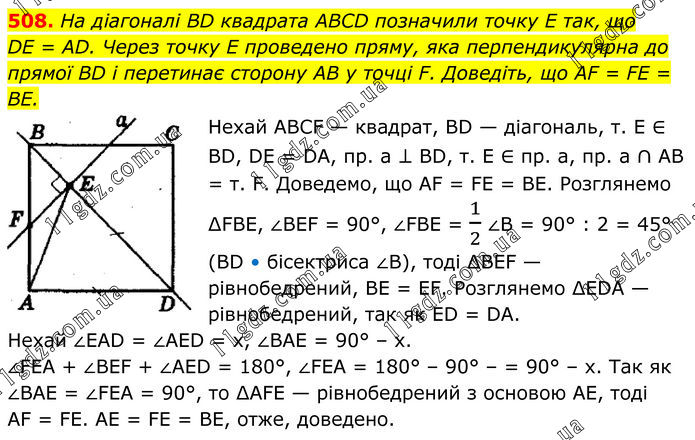 508. На діагоналі BD квадрата ABCD позначили точку E так, що DE = AD. Через точку E проведено пряму, яка перпендикулярна до прямої BD і перетинає сторону AB у точці F. Доведіть, що AF = FE = BE. Нехай АВСF — квадрат, ВD — діагональ, т. E ∈ ВD, DE = DА, пр. а ⊥ ВD, т. E ∈ пр. а, пр. а ∩ АВ = т. F. Доведемо, що АF = FЕ = ВЕ. Розглянемо ∆FВЕ, ∠BЕF = 90°, ∠FВЕ = 1/2 ∠В = 90° : 2 = 45° (ВD • бісектриса ∠В), тоді ∆BЕF — рівнобедрений, ВЕ = ЕF. Розглянемо ∆ЕDА — рівнобедрений, так як ED = DА. Нехай ∠EAD = ∠AED = x, ∠BAE = 90° – х. ∠FЕА + ∠ВЕF + ∠AЕD = 180°, ∠FЕА = 180° – 90° – = 90° – x. Так як ∠ВАЕ = ∠FЕА = 90°, то ∆АFЕ — рівнобедрений з основою АЕ, тоді АF = FЕ. АЕ = FЕ = ВЕ, отже, доведено.