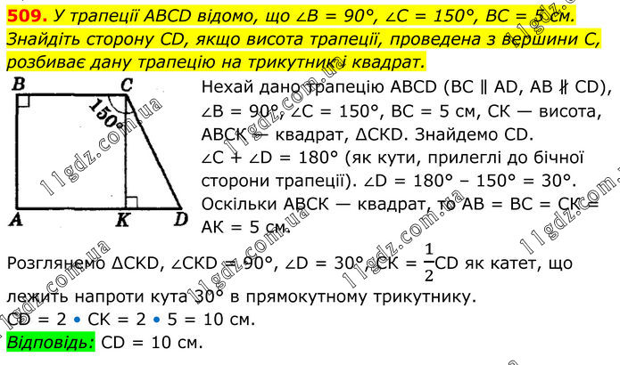 509. У трапеції ABCD відомо, що ∠B = 90°, ∠C = 150°, BC = 5 см. Знайдіть сторону CD, якщо висота трапеції, проведена з вершини C, розбиває дану трапецію на трикутник і квадрат. Нехай дано трапецію АВСD (ВС ∥ АD, АВ ∦ СD), ∠B = 90°, ∠С = 150°, ВС = 5 см, СК — висота, АВСК — квадрат, ∆СКD. Знайдемо СD. ∠С + ∠D = 180° (як кути, прилеглі до бічної сторони трапеції). ∠D = 180° – 150° = 30°. Оскільки АВСК — квадрат, то АВ = ВС = СК = АК = 5 см. Розглянемо ∆СKD, ∠СКD = 90°, ∠D = 30°, СК = 1/2СD як катет, що лежить напроти кута 30° в прямокутному трикутнику. CD = 2 • CK = 2 • 5 = 10 см. Відповідь: СD = 10 см.