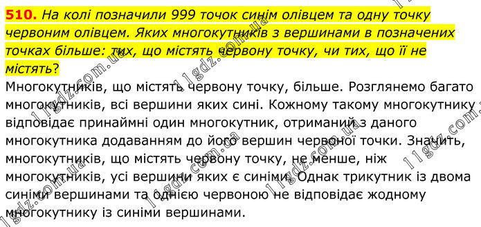 510. На колі позначили 999 точок синім олівцем та одну точку червоним олівцем. Яких многокутників з вершинами в позначених точках більше: тих, що містять червону точку, чи тих, що її не містять? Многокутників, що містять червону точку, більше. Розглянемо багато многокутників, всі вершини яких сині. Кожному такому многокутнику відповідає принаймні один многокутник, отриманий з даного многокутника додаванням до його вершин червоної точки. Значить, многокутників, що містять червону точку, не менше, ніж многокутників, усі вершини яких є синіми. Однак трикутник із двома синіми вершинами та однією червоною не відповідає жодному многокутнику із синіми вершинами.