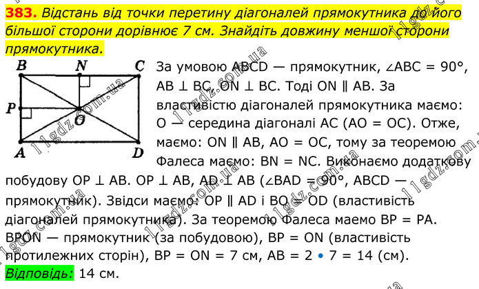 383. Відстань від точки перетину діагоналей прямокутника до його більшої сторони дорівнює 7 см. Знайдіть довжину меншої сторони прямокутника. За умовою АВСD — прямокутник, ∠АВС = 90°, АВ ⊥ ВС, ОN ⊥ ВС. Тоді ОN ∥ АВ. За властивістю діагоналей прямокутника маємо: О — середина діагоналі АС (АО = ОС). Отже, маємо: ОN ∥ АВ, АО = ОС, тому за теоремою Фалеса маємо: ВN = NС. Виконаємо додаткову побудову ОР ⊥ АВ. ОР ⊥ АВ, АD ⊥ АВ (∠ВАD = 90°, АВСD — прямокутник). Звідси маємо: ОР ∥ АD і ВО = ОD (властивість діагоналей прямокутника). За теоремою Фалеса маемо ВР = РА. ВРОN — прямокутник (за побудовою), ВР = ОN (властивість протилежних сторін), ВР = ОN = 7 см, АВ = 2 • 7 = 14 (см). Відповідь: 14 см.