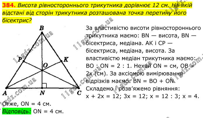 384. Висота рівностороннього трикутника дорівнює 12 см. На якій відстані від сторін трикутника розташована точка перетину його бісектрис? За властивістю висоти рівностороннього трикутника маємо: ВN — висота, ВN — бісектриса, медіана. АК і СР — бісектриса, медіана, висота. За властивістю медіан трикутника маємо: ВО : ОN = 2 : 1. Нехай ОN = см, ОВ = 2х (см). За аксіомою вимірювання відрізків маємо: ВN = ВО + ОN. Складемо і розв’яжемо рівняння: x + 2х = 12; 3x = 12; x = 12 : 3; x = 4. Отже, ОN = 4 см. Відповідь: ОN = 4 см.