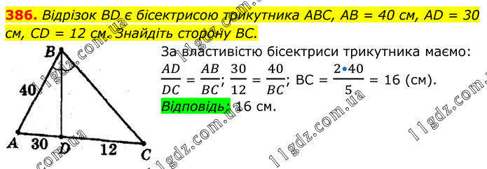 386. Відрізок BD є бісектрисою трикутника ABC, AB = 40 см, AD = 30 см, CD = 12 см. Знайдіть сторону BC. За властивістю бісектриси трикутника маємо: AD/DC = AB/BC; 30/12 = 40/BC; BC = (2•40)/5 = 16 (см). Відповідь: 16 см.