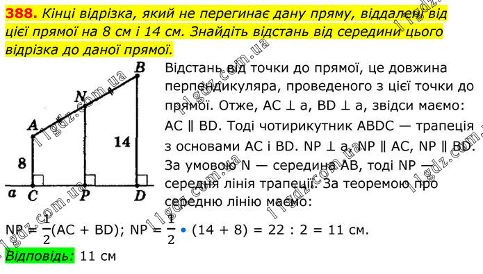 388. Кінці відрізка, який не перегинає дану пряму, віддалені від цієї прямої на 8 см і 14 см. Знайдіть відстань від середини цього відрізка до даної прямої. Відстань від точки до прямої, це довжина перпендикуляра, проведеного з цієї точки до прямої. Отже, АС ⊥ а, ВD ⊥ а, звідси маємо: АС ∥ ВD. Тоді чотирикутник АВDС — трапеція з основами АС і ВD. NР ⊥ а, NР ∥ АС, NР ∥ ВD. За умовою N — середина АВ, тоді NР — середня лінія трапеції. За теоремою про середню лінію маємо: NР = 1/2(АС + ВD); NР = 1/2 • (14 + 8) = 22 : 2 = 11 см. Відповідь: 11 см