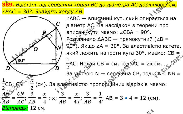 389. Відстань від середини хорди BC до діаметра AC дорівнює 3 см, ∠BAC = 30°. Знайдіть хорду AB. ∠АВС — вписаний кут, який опирається на діаметр АС. За наслідком з теореми про вписані кути маємо: ∠СВА = 90°. Розглянемо ∆АВС — прямокутний (∠В = 90°). Якщо ∠A = 30°. За властивістю катета, який лежить напроти кута 30°, маємо: СВ = 1/2АС. Нехай СВ = см, тоді АС = 2х см. За умовою N — середина СВ, тоді СN = NВ = 1/2СВ; СN = x/2 (см). За властивістю пропорційних відрізків маємо: AN/AB = CN/AC; 3/AB = x/4 : х; 3/AB = x/4x; 3/AB = 1/4; АВ = 3 • 4 = 12 (см). Відповідь: 12 см.