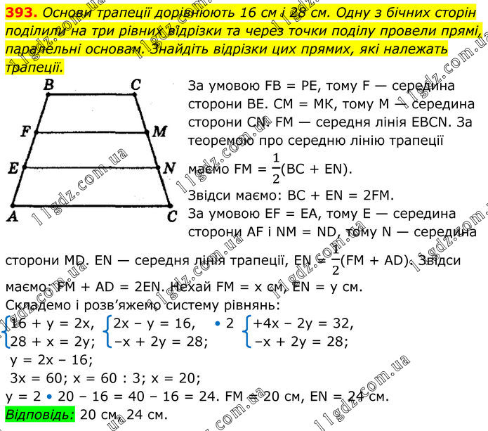 Основи трапеції дорівнюють 16 см і 28 см. Одну з бічних сторін поділили на три рівних відрізки та через точки поділу провели прямі, паралельні основам. Знайдіть відрізки цих прямих, які належать трапеції. За умовою FВ = РЕ, тому F — середина сторони ВЕ. СМ = МК, тому М — середина сторони СN. FМ — середня лінія ЕВСN. За теоремою про середню лінію трапеції маємо FМ = 1/2(ВС + ЕN). Звідси маємо: ВС + ЕN = 2FМ. За умовою ЕF = EА, тому Е — середина сторони АF і NМ = ND, тому N — середина сторони МD. EN — середня лінія трапеції, ЕN = 1/2(FМ + АD). Звідси маємо: FМ + АD = 2EN. Нехай FМ = х см, ЕN = y см. Складемо і розв’яжемо систему рівнянь: 16 + y = 2x, 2x – y = 16, • 2 +4x – 2y = 32, 28 + x = 2y; –x + 2y = 28; –x + 2y = 28; y = 2x – 16; 3x = 60; x = 60 : 3; x = 20; у = 2 • 20 – 16 = 40 – 16 = 24. FМ = 20 см, ЕN = 24 см. Відповідь: 20 см, 24 см.