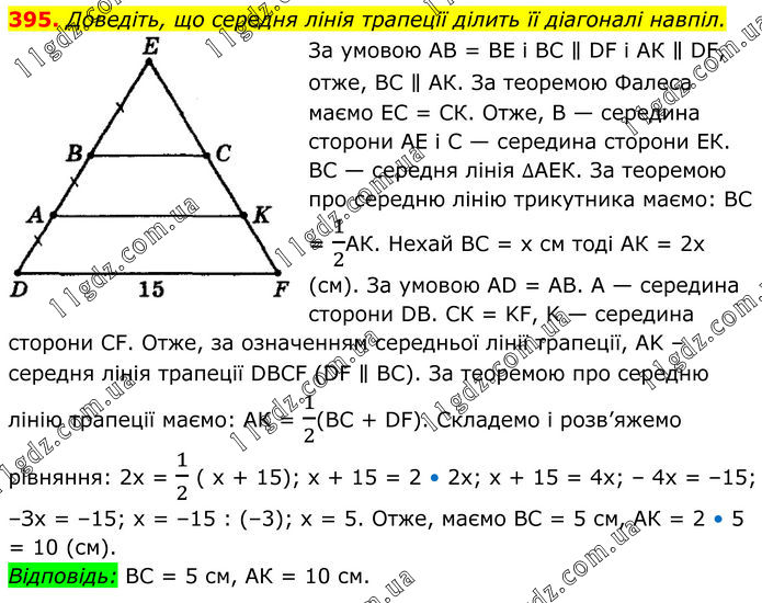 Доведіть, що середня лінія трапеції ділить її діагоналі навпіл. За умовою АВ = ВЕ і ВС ∥ DF і АК ∥ DF, отже, ВС ∥ АК. За теоремою Фалеса маємо ЕС = СК. Отже, В — середина сторони АЕ і С — середина сторони ЕК. ВС — середня лінія ∆АЕК. За теоремою про середню лінію трикутника маємо: ВС = 1/2АК. Нехай ВС = х см тоді АК = 2х (см). За умовою АD = АВ. А — середина сторони DВ. СК = KF, K — середина сторони СF. Отже, за означенням середньої лінії трапеції, AK – середня лінія трапеції DBCF (DF ∥ BC). За теоремою про середню лінію трапеції маємо: АК = 1/2(ВС + DF). Складемо і розв’яжемо рівняння: 2х = 1/2 ( х + 15); х + 15 = 2 • 2х; х + 15 = 4х; – 4х = –15; –Зх = –15; х = –15 : (–3); х = 5. Отже, маємо ВС = 5 см, АК = 2 • 5 = 10 (см). Відповідь: ВС = 5 см, АК = 10 см.