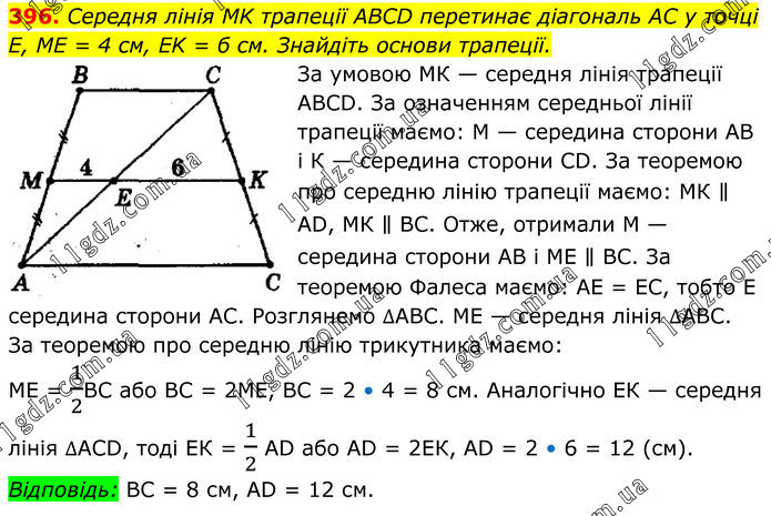 Середня лінія MK трапеції ABCD перетинає діагональ AC у точці Е, ME = 4 см, EK = б см. Знайдіть основи трапеції. За умовою МК — середня лінія трапеції АВСD. За означенням середньої лінії трапеції маємо: М — середина сторони АВ і К — середина сторони СD. За теоремою про середню лінію трапеції маємо: МК ∥ АD, МК ∥ ВС. Отже, отримали М — середина сторони АВ і МЕ ∥ ВС. За теоремою Фалеса маємо: АЕ = ЕС, тобто Е середина сторони АС. Розглянемо ∆АВС. МЕ — середня лінія ∆АВС. За теоремою про середню лінію трикутника маємо: МЕ = 1/2ВС або ВС = 2МЕ, ВС = 2 • 4 = 8 см. Аналогічно ЕК — середня лінія ∆АСD, тоді ЕК = 1/2 АD або АD = 2ЕК, АD = 2 • 6 = 12 (см). Відповідь: ВС = 8 см, АD = 12 см.
