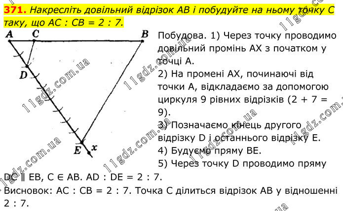 371. Накресліть довільний відрізок AB і побудуйте на ньому точку C таку, що AC : CB = 2 : 7. Побудова. 1) Через точку проводимо довільний промінь АХ з початком у точці А. 2) На промені АХ, починаючі від точки А, відкладаємо за допомогою циркуля 9 рівних відрізків (2 + 7 = 9). 3) Позначаємо кінець другого відрізку D і останнього відрізку Е. 4) Будуємо пряму ВЕ. 5) Через точку D проводимо пряму DС ∥ ЕВ, C ∈ АВ. АD : DЕ = 2 : 7. Висновок: АС : СВ = 2 : 7. Точка С ділиться відрізок АВ у відношенні 2 : 7.