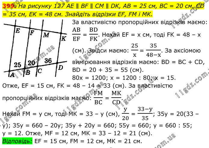 На рисунку 127 AE ∥ BF ∥ CM ∥ DK, AB = 25 см, BC = 20 см, CD = 35 см, EK = 48 см. Знайдіть відрізки EF, FM і MK. За властивістю пропорційних відрізків маємо: AB/EF = BD/FK. Нехай ЕF = х см, тоді FК = 48 – х (см). Звідси маємо: 25/x = 35/(48-x). За аксіомою вимірювання відрізків маємо: ВD = ВС + СD, ВD = 20 + 35 = 55 (см). 80x = 1200; х = 1200 : 80; х = 15. Отже, ЕF = 15 см, FК = 48 – 14 = 33 (см). За властивістю пропорційних відрізків маємо: FM/BC = MK/CD. Нехай FМ = у см, тоді МК = 33 – у (см), y/20 = (33-y)/35; 35у = 20(33 – у); 35у = 660 – 20у; 35у + 20у = 660; 55у = 660; у = 660 : 55; у = 12. Отже, МF = 12 см, МК = 33 – 12 = 21 (см). Відповідь: ЕF = 15 см, FМ = 12 см, МК = 21 см.